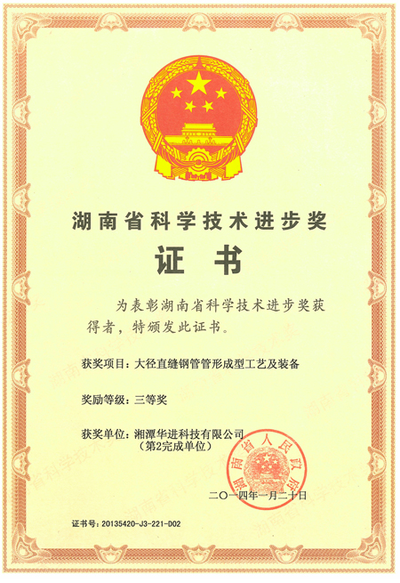 目前,湖南省科學(xué)技術(shù)廳公布了2013年湖南省科學(xué)技術(shù)進(jìn)步獎(jiǎng)綜合評(píng)審結(jié)果,華進(jìn)科技“大徑直縫鋼管管型成型工藝及裝備”項(xiàng)目榮獲2013年度湖南省科技進(jìn)步三等獎(jiǎng)。