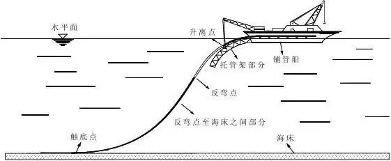 目前海底管道鋪設(shè)技術(shù)中應(yīng)用最多的方法就是S型鋪管法,這種方法一般要安排艘起拋錨拖輪或者多艘起拋錨拖輪來支持鋪管,工程在展開之前,需將一個(gè)錨定位在海床上,然后將錨纜引過托管架并系到第一根管子的端口,通過托管架的支撐,它會(huì)自然的彎曲成“S”型曲線。如圖2所示。根據(jù)受力點(diǎn)的不同,可分為三個(gè)區(qū)域,即上彎段、中間段、下彎段。上彎段一般是從鋪管船上的張緊器開始向下延伸到管道脫離托管架支撐為止;下彎段是從拐點(diǎn)到管線在海床泥面的著地點(diǎn)這段區(qū)域;中間段一般較短,即上彎段和下彎段之間的部分。目前,S型鋪管技術(shù)可使用多條作業(yè)線進(jìn)行管線預(yù)制,需要一個(gè)托管架,具有多個(gè)焊接站,隨著水深的增加,托管架長(zhǎng)度會(huì)增加、張力也會(huì)增大,但它的穩(wěn)定性會(huì)減弱、風(fēng)險(xiǎn)也會(huì)增加。