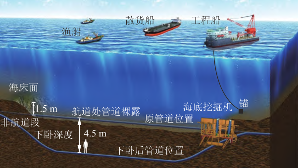 中國(guó)海底油氣管道事故應(yīng)急處置及維保體系得到全面建設(shè)與完善,大深度海底挖掘機(jī)、重力式常壓干式艙等用于事故處置、維修、保護(hù)的系列創(chuàng)新發(fā)明裝備面世并成功應(yīng)用,海底管道水下維修等系列國(guó)家工法與標(biāo)準(zhǔn)體系已經(jīng)構(gòu)建形成。在渤??绾降篮5坠艿啦煌.a(chǎn)施工中,解決了硬質(zhì)海床條件下在役管道整體下臥4.5m的技術(shù)難題,使跨航道海底管道得到有效保護(hù)(圖10)。有效攻克了泄漏海底管道應(yīng)急封堵、水下濕式不停產(chǎn)搶修、中深水犁式挖溝等關(guān)鍵技術(shù)和裝備,并得到工程應(yīng)用,實(shí)現(xiàn)了中國(guó)全海域海底管道事故的快速處置。近10年來,中國(guó)已成功處置各類海底管道受損事故31起,有效保護(hù)了海洋生態(tài)環(huán)境。