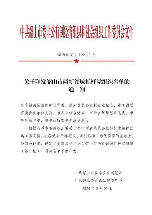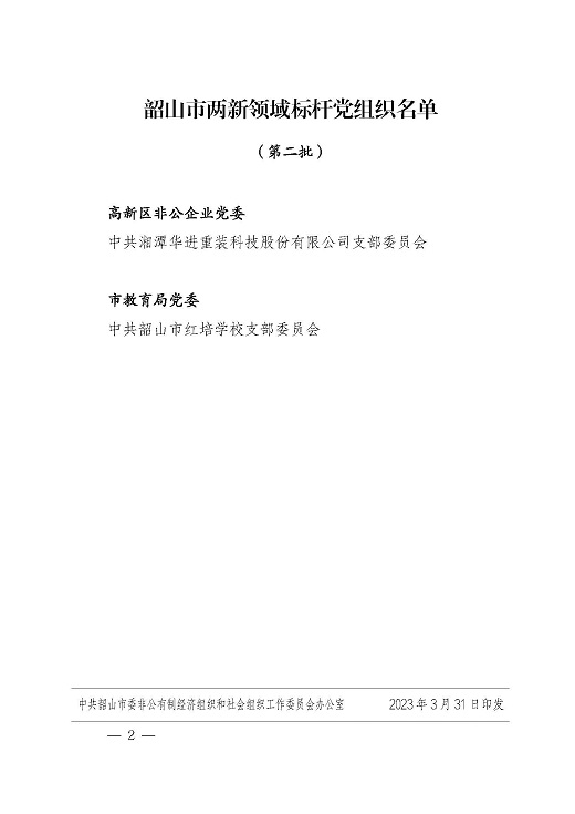 2023年3月31日,根據(jù)湘潭市委兩新工委關于全市兩新系統(tǒng)縣級標桿黨組織創(chuàng)建工作安排,在各黨委嚴格把關、部門聯(lián)審、擇優(yōu)推薦的基礎上,經(jīng)綜合評審,確定中共湘潭華進重裝科技股份有限公司支部委員會等2個基層黨組織為韶山市兩新領域標桿黨組織。